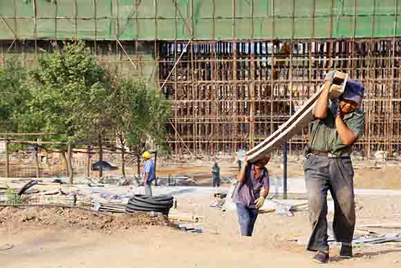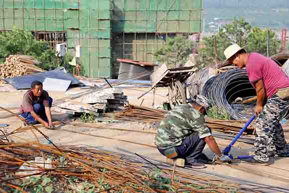 在公園主山門(mén)施工場(chǎng)地,工人李德福正在緊張地忙碌著(zhù)。他個(gè)子不高,可干活的勁頭一點(diǎn)都不少,蹲在水泥地上頭都不抬,一門(mén)心思地拿著(zhù)錘子敲敲打打。李德福告訴記者,他是河南人,今年46歲,正在做花壇的前期工作。李德福話(huà)不多,但干活很賣(mài)力氣,汗水在他黝黑的臉龐上從沒(méi)間斷過(guò)。談起熱和累,李德福笑呵呵地說(shuō):“不算啥事,和那些天天要爬山的同鄉比,我這活兒算輕巧的了。”